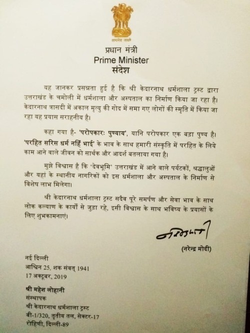 यह जानकर प्रसन्नता कि श्री केदारनाथ धर्मशाला ट्रस्ट द्वारा उत्तराखंड के चमोली में धर्मशाला और अस्पताल का निर्माण किया जा रहा है | केदारनाथ त्रासदी में अकाल मृत्यु की गोद में सा गए लोगो की स्मृति में किया जा रहा यह प्रयास सराहनीय है